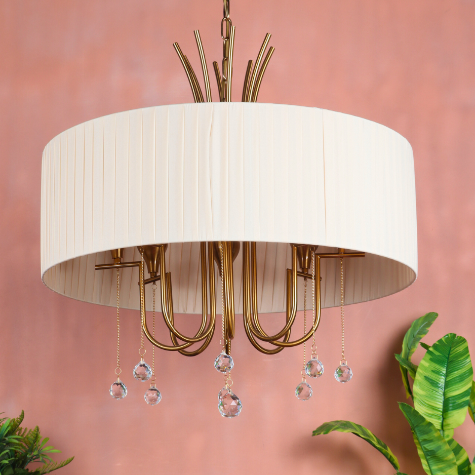 Sparkling Crystal Accents: Beneath the shade, multiple hanging arms are adorned with clear, polished Crystal Drops, catching the light and adding a layer of subtle luxury and sparkle.