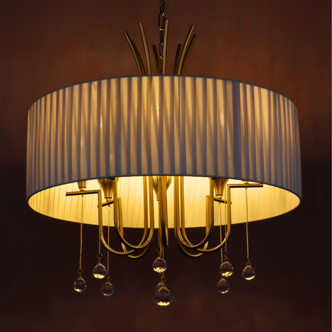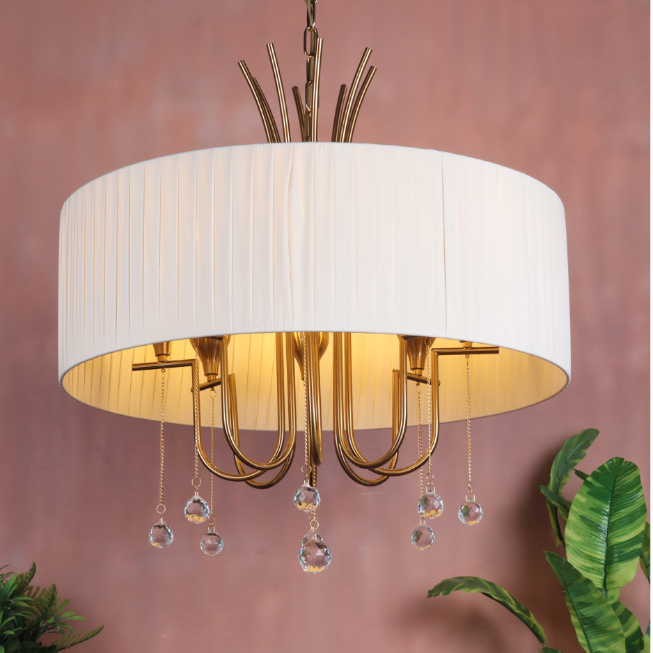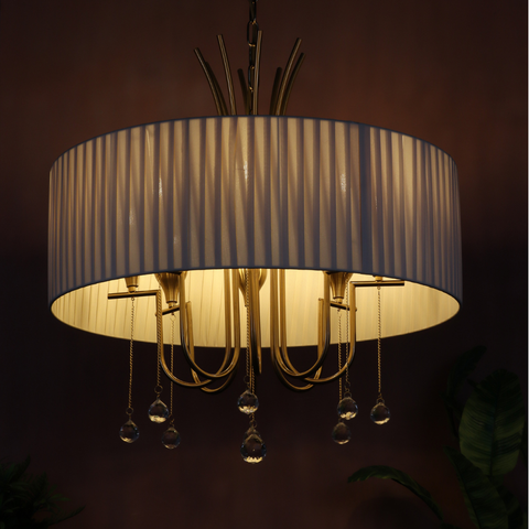 GRAVINNA Modern Drum Chandelier- Pleated Cloth Shade & Crystal Drops