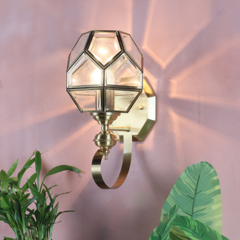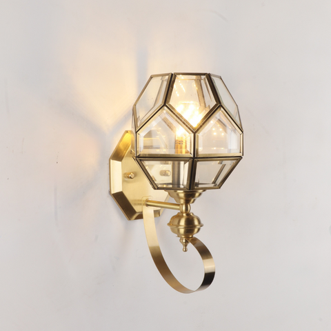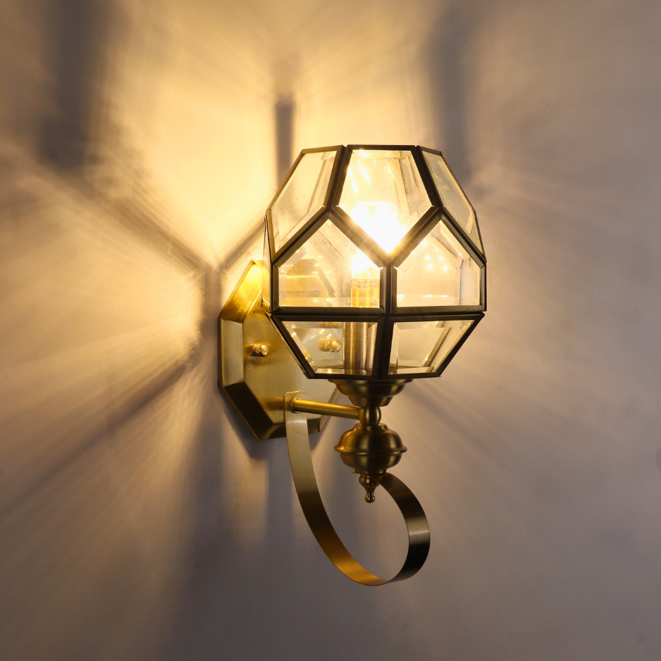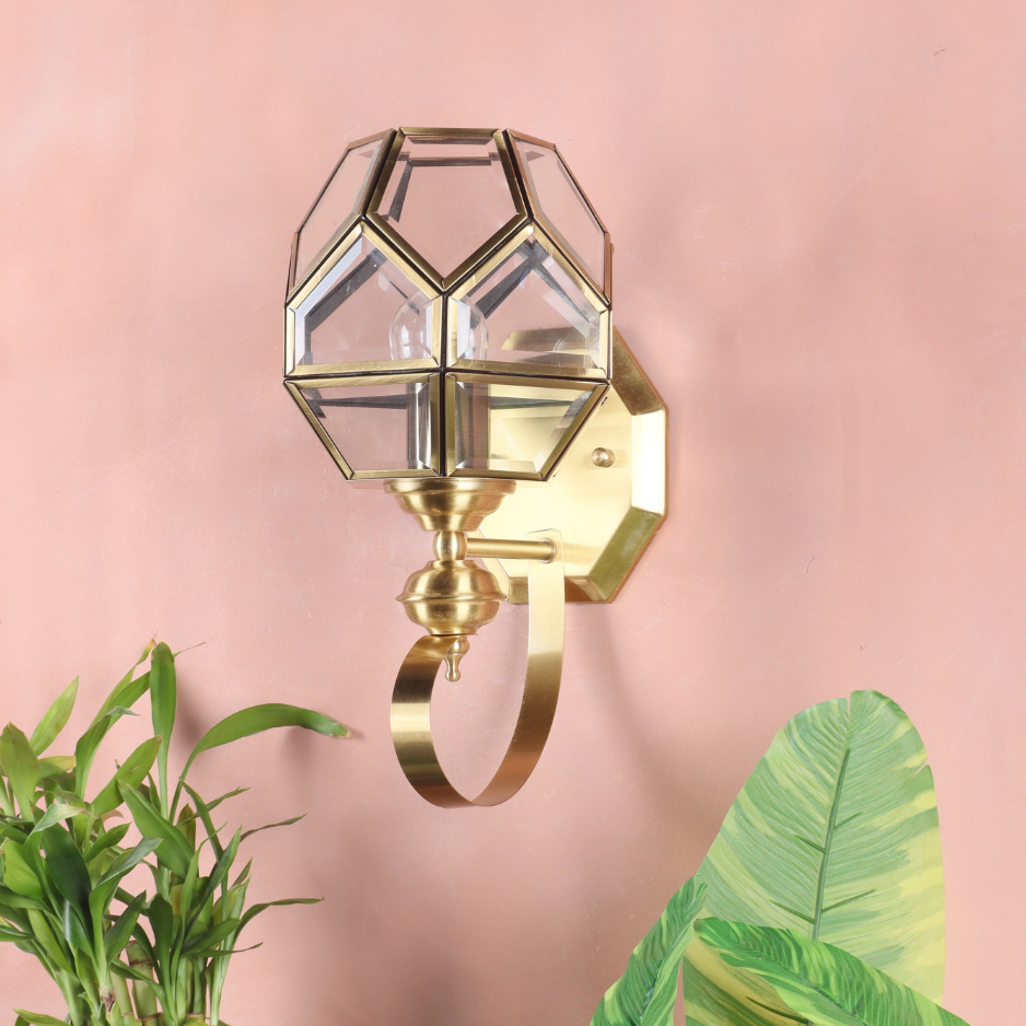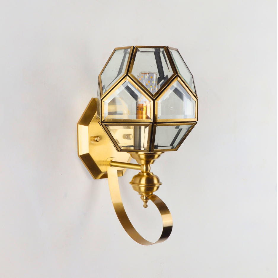 Make a striking statement with the CORVINE Geometric Brass Wall Sconce. This sophisticated wall light beautifully merges the elegance of brass with a distinctive, multi-faceted geometric shade, channeling a chic mid-century modern or luxury aesthetic.