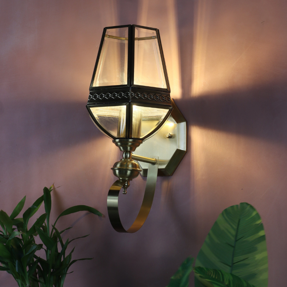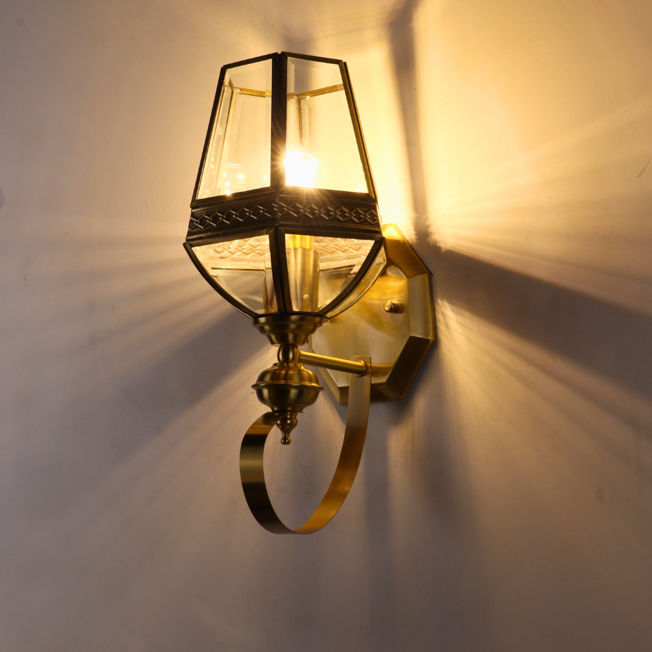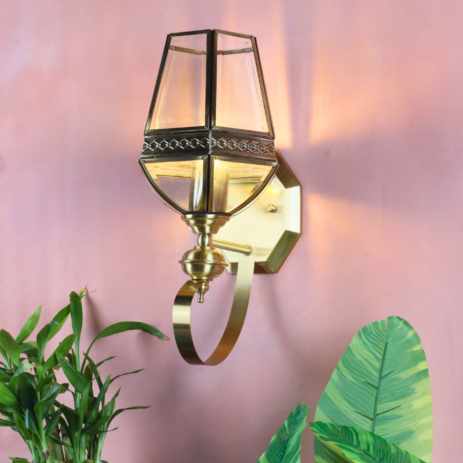 Distinct Geometric Design: The clear glass shade features a multi-faceted lantern silhouette, framed by rich Brass and detailed with a decorative mid-section band.