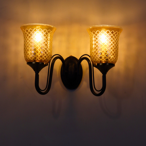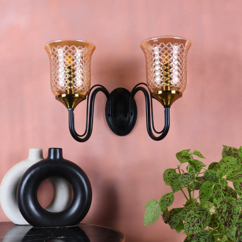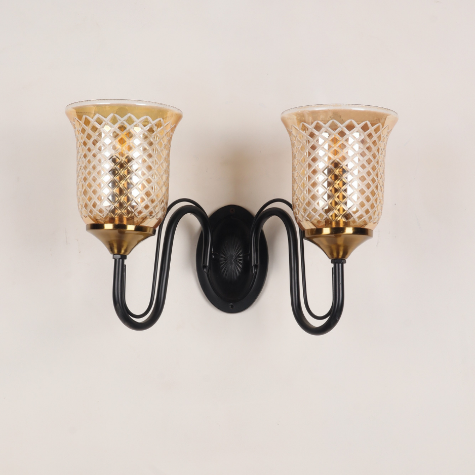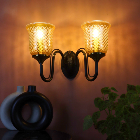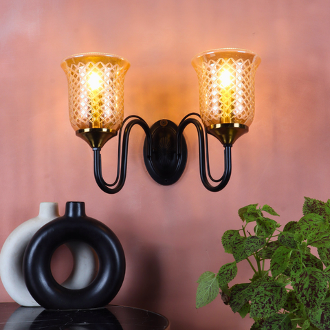 The Aurevine Wall Light brings a touch of classic sophistication and luxury charm to your interiors. Featuring two beautifully crafted amber glass shades with a diamond-cut pattern, mounted on a sleek black frame with golden holders, this wall light exudes warmth and elegance.