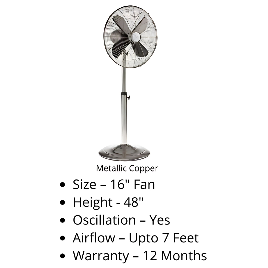 Bring a modern, polished look to your space with the NEUTRA SPIN, a 16-inch pedestal fan featuring a sleek Metallic Copper and Silver finish. This fan is designed for both style and performance, making it a perfect addition to contemporary or minimalist interiors. Its elegant stand and base complement its powerful cooling capabilities.