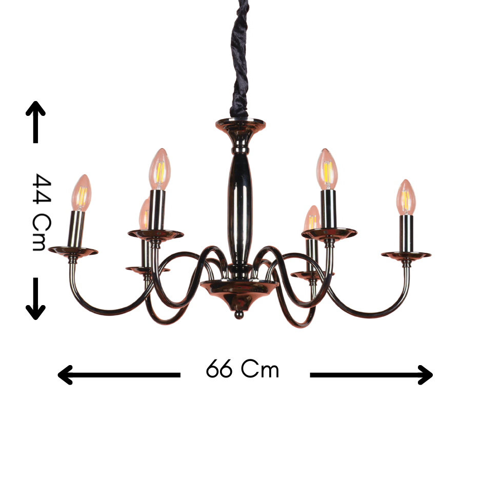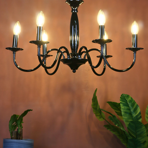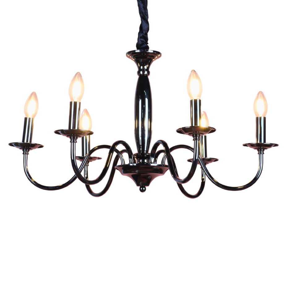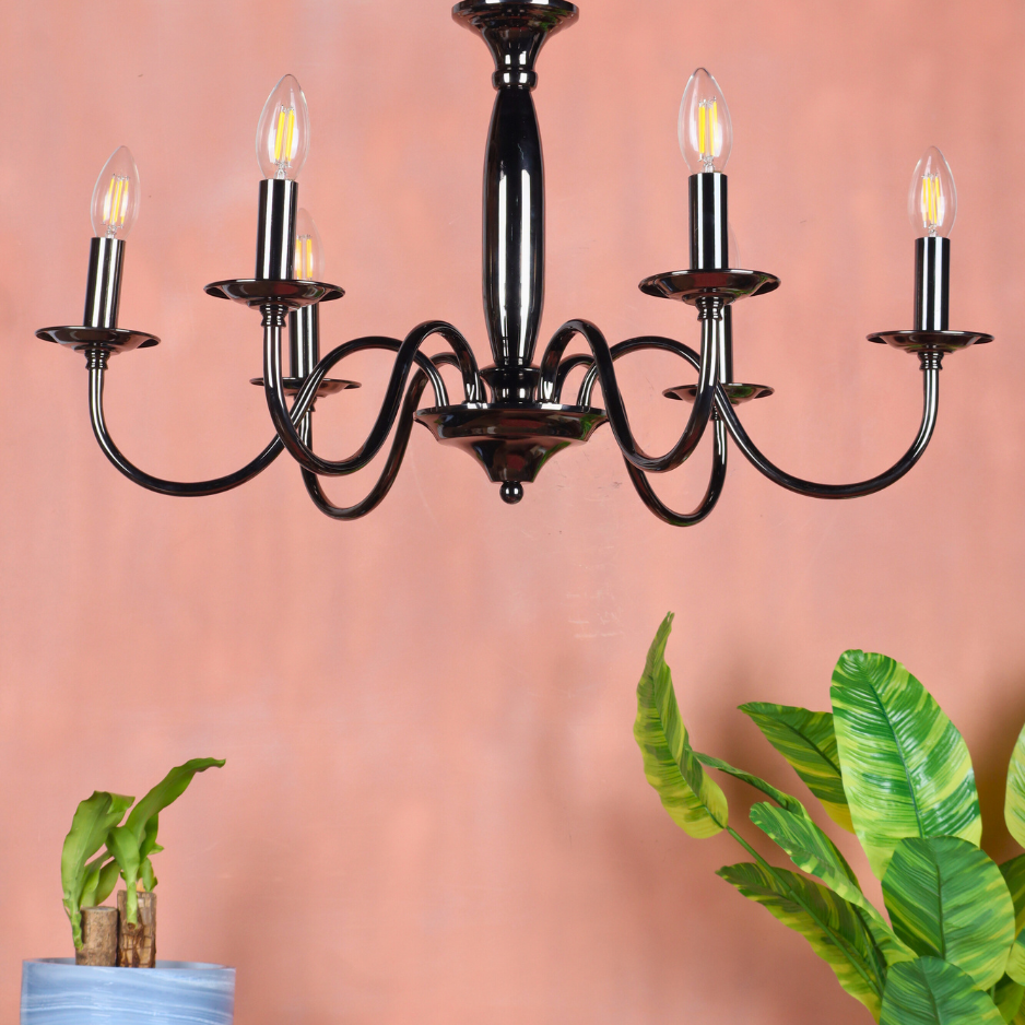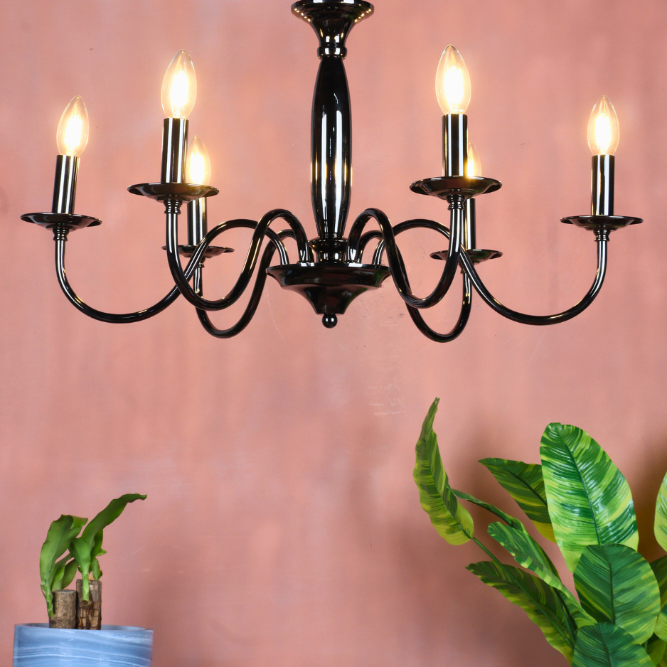 The SYLVENNE is the ultimate way to bring a touch of bold sophistication and historical charm into a modern setting. By targeting keywords like 'black candelabra chandelier,' '6-light black metal fixture,' 'E-14 candle style light,' 'polished gunmetal chandelier,' and 'modern transitional lighting,' this description ensures visibility to customers seeking a dramatic and stylish ceiling fixture.