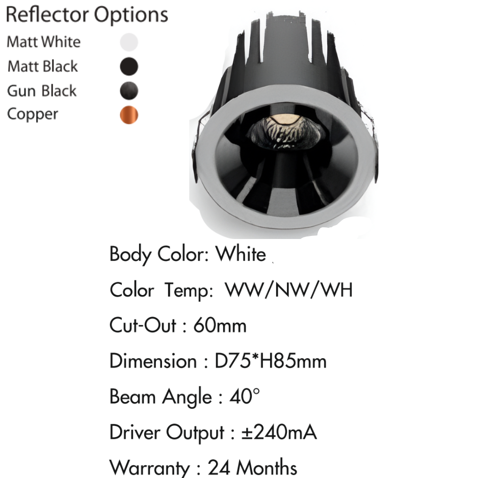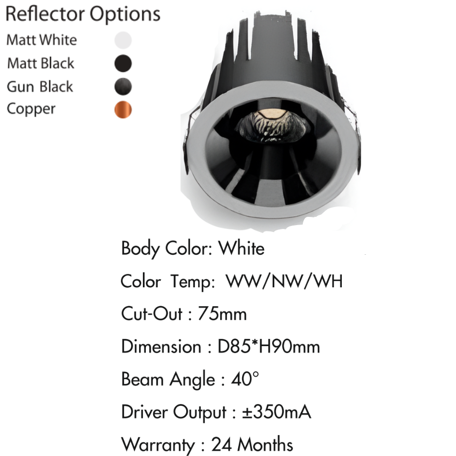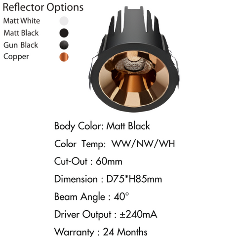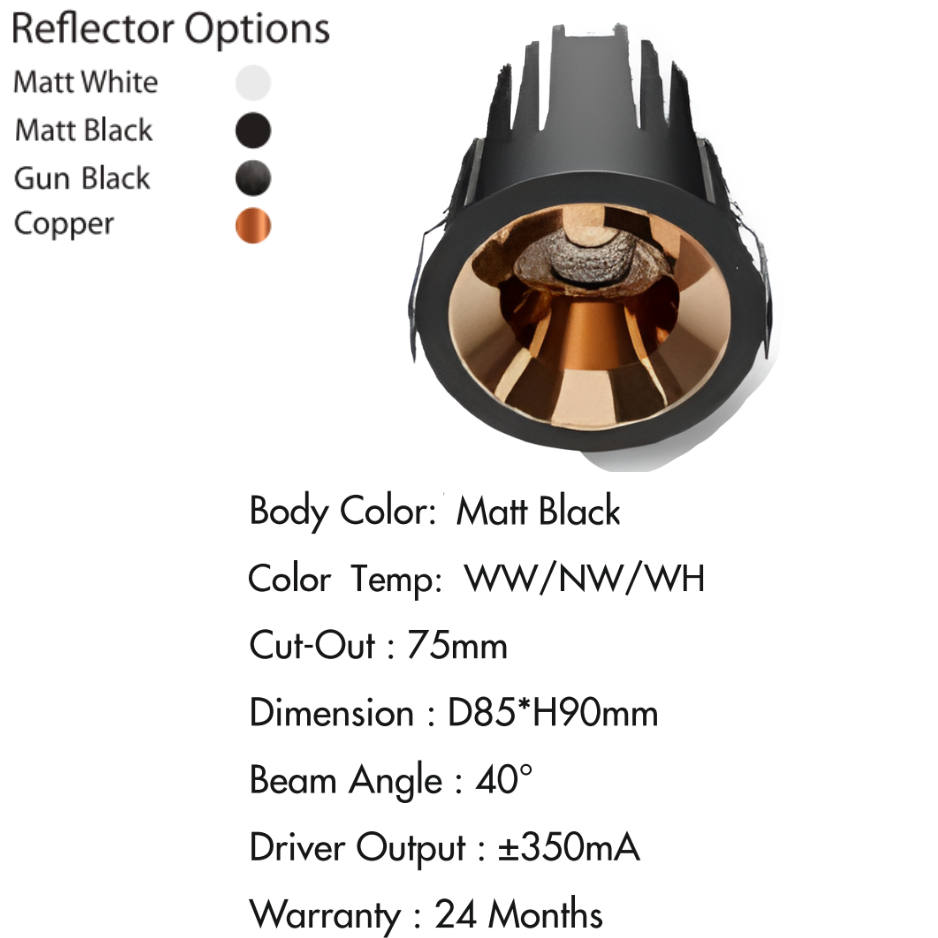 Reflector Options: Matt White, Matt Black, Gun Black, Copper