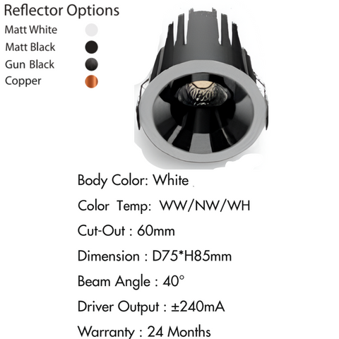 Stylish Design & Reflector Options: The "Soft Spot" series boasts a sophisticated design with body color options of White and Matt Black. Further personalize your lighting with reflector options including Matt White, Matt Black, Gun Black, and Copper to match your interior aesthetic.