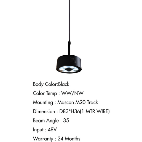 Modern Pendant Design: With its sleek black body and a 1-meter wire, this fixture brings a contemporary and sophisticated touch to any setting, hanging elegantly from the Mascon M20 Track system.