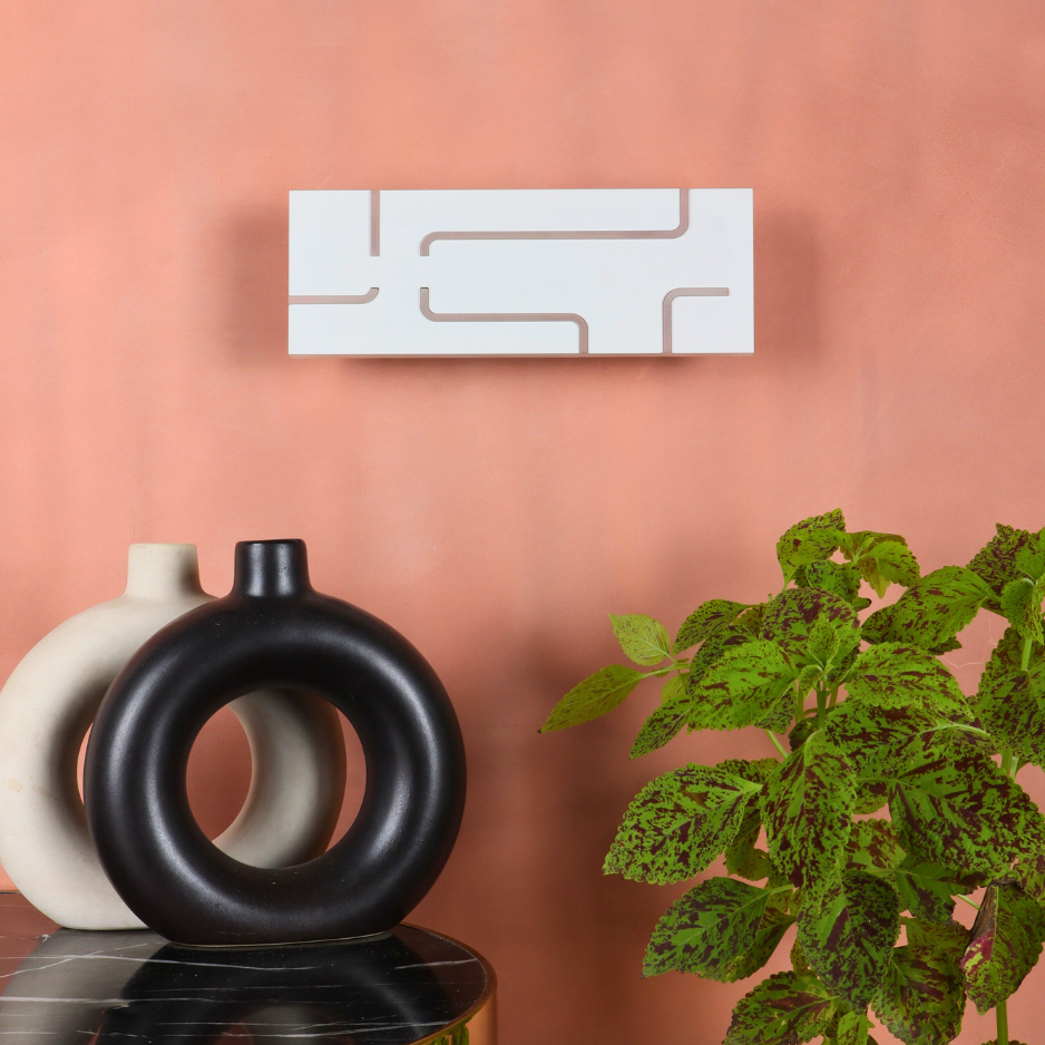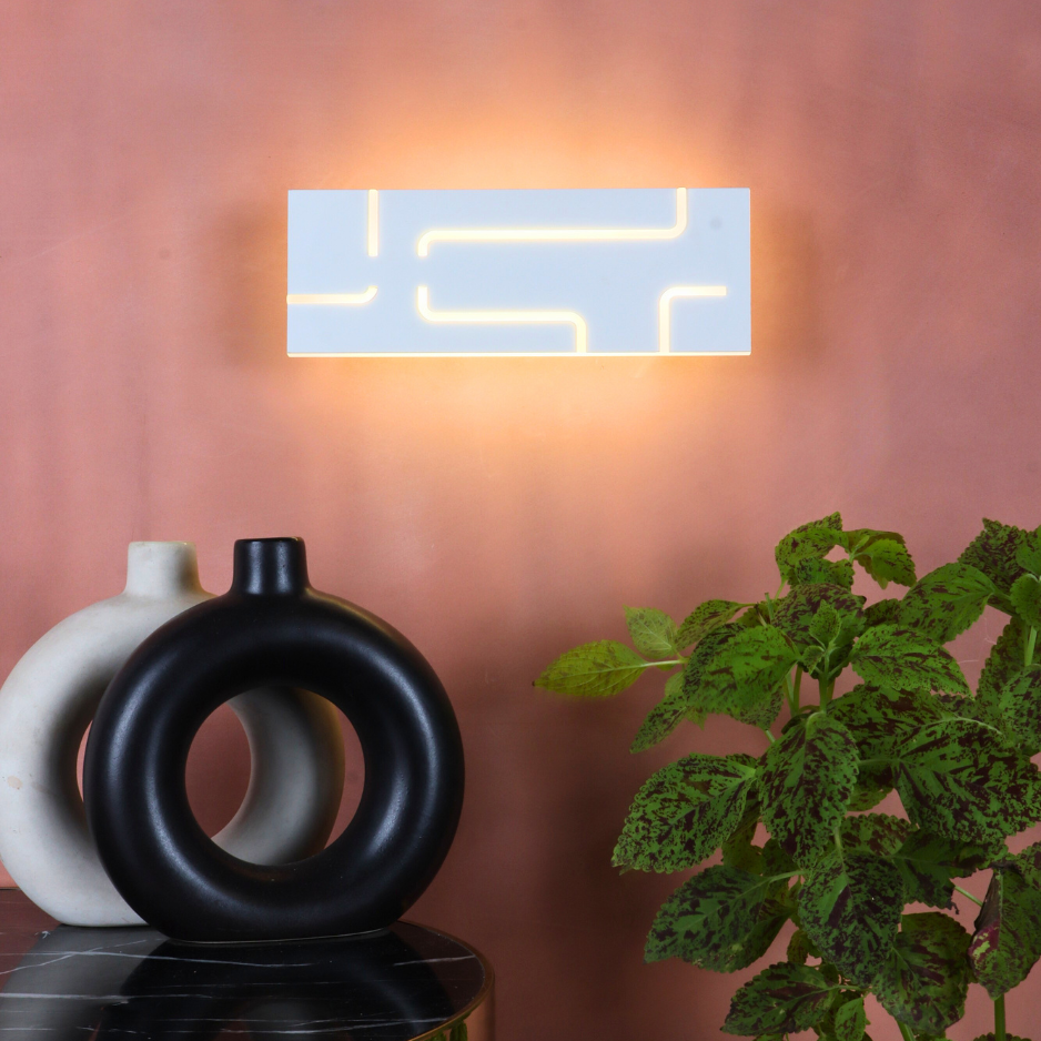 Introduce a touch of modern artistry to your interiors with the Trivane Wall Light, a contemporary piece defined by its clean rectangular form and unique geometric cut-out patterns. This stylish design casts soft, diffused LED light, creating striking patterns on walls while maintaining a minimal, modern aesthetic.