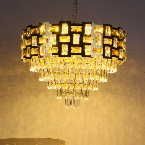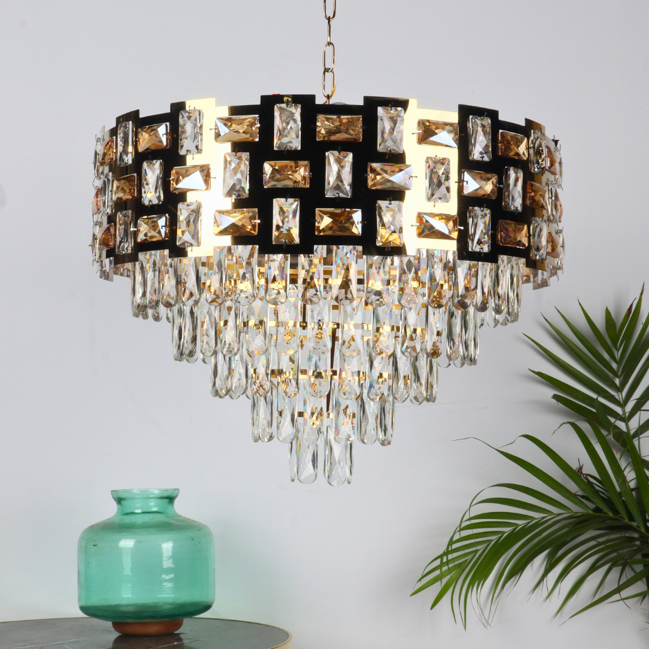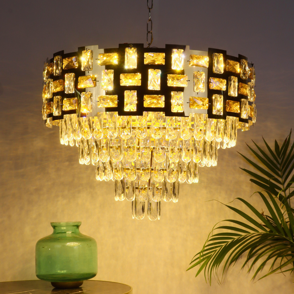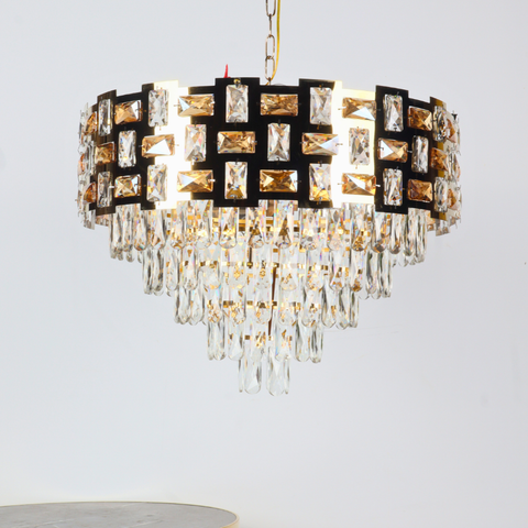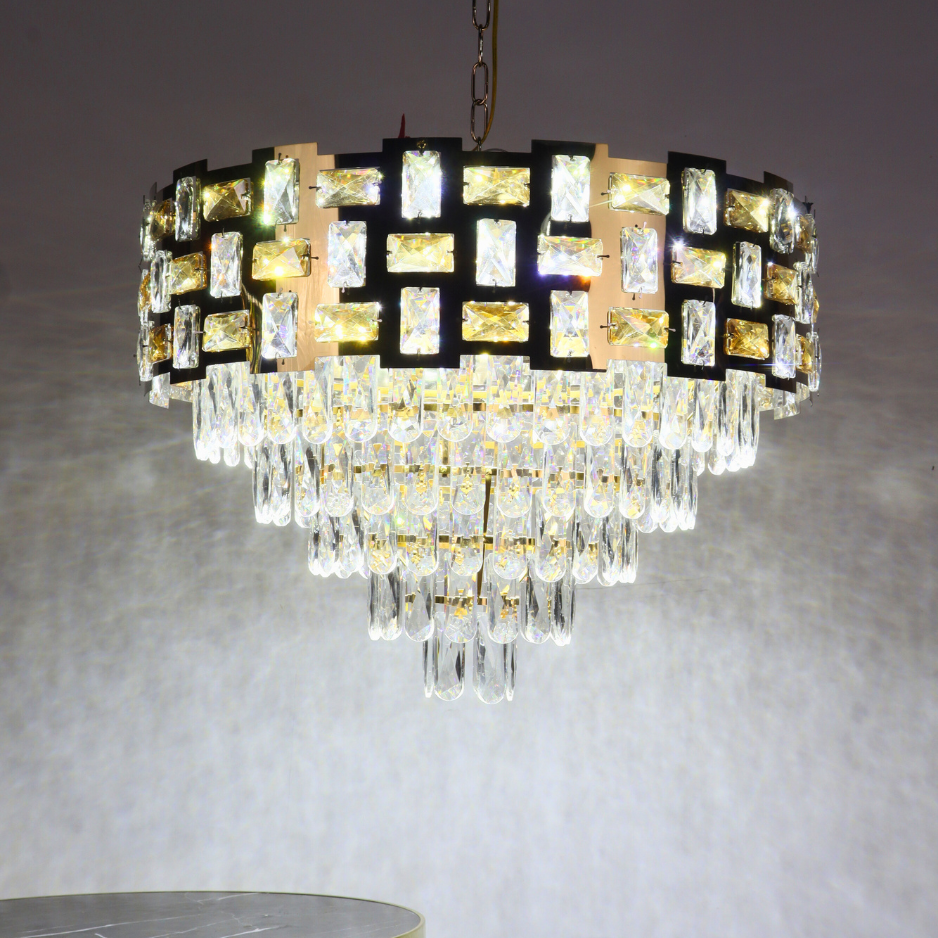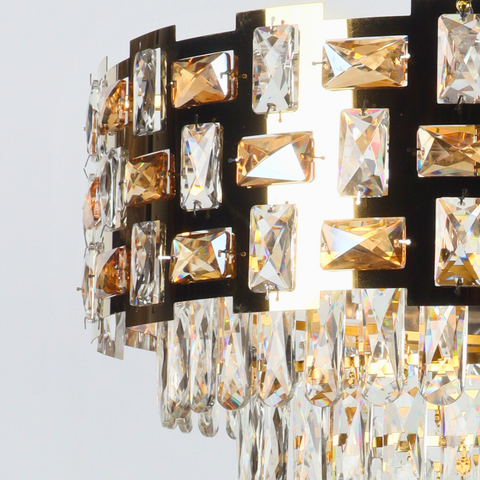 Bold Geometric Design: The upper drum features a striking arrangement of rectangular crystals in alternating clear and warm amber/cognac tones, set against a rich gold-tone and black metallic frame. This high-contrast design creates a dynamic, visually arresting display.