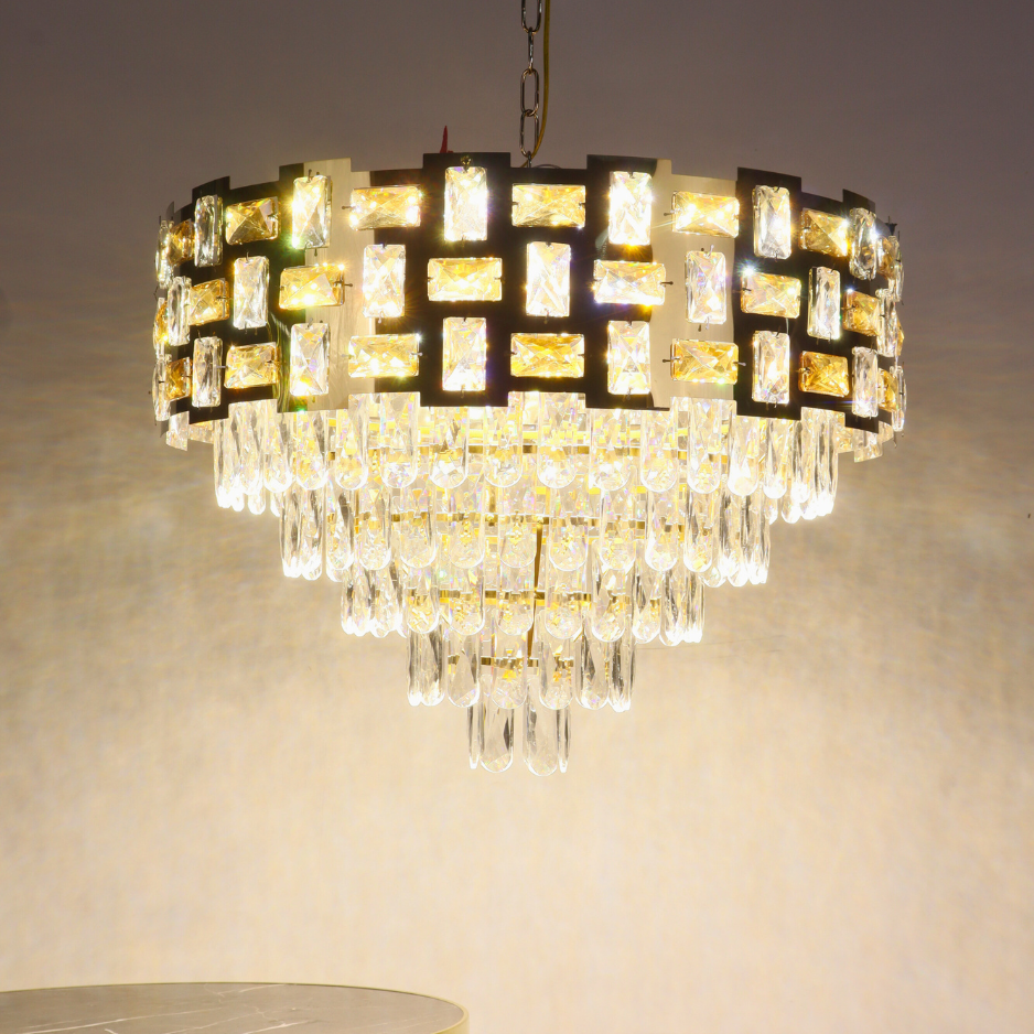 Cascading Crystal Pendants: Below the geometric band, tiers of elegant, elongated crystal teardrops provide classic chandelier sparkle, ensuring brilliant light refraction and a luxurious ambiance.