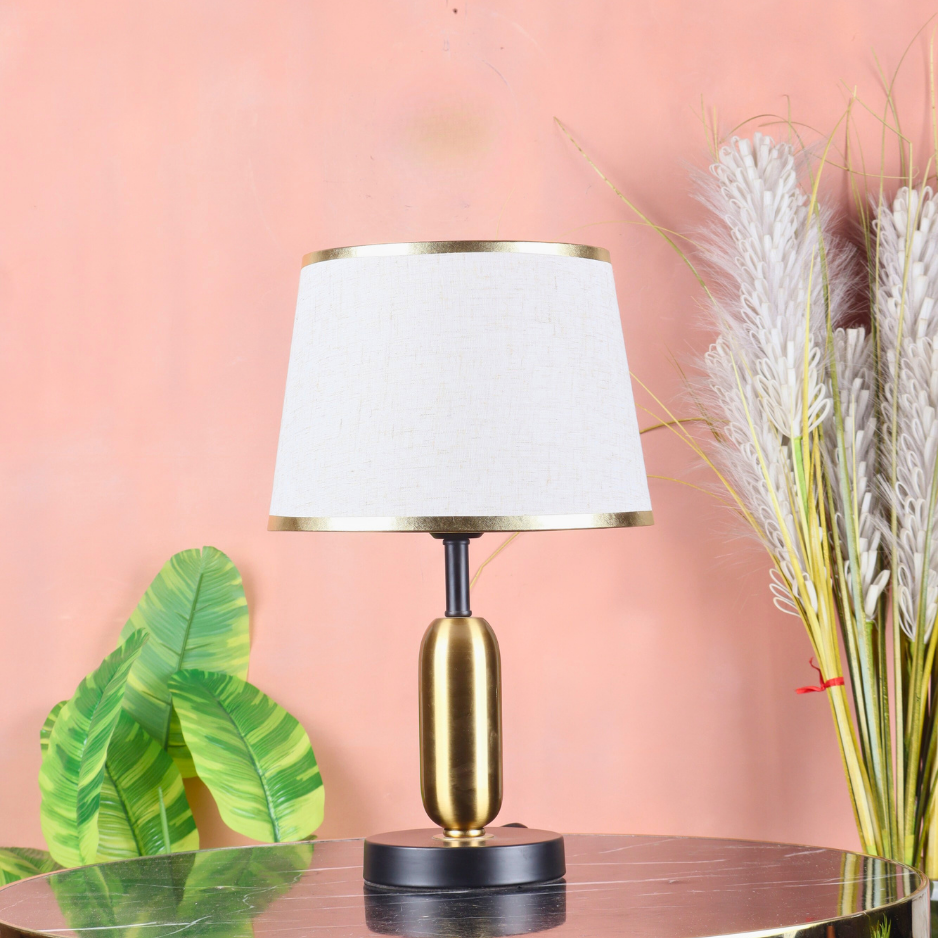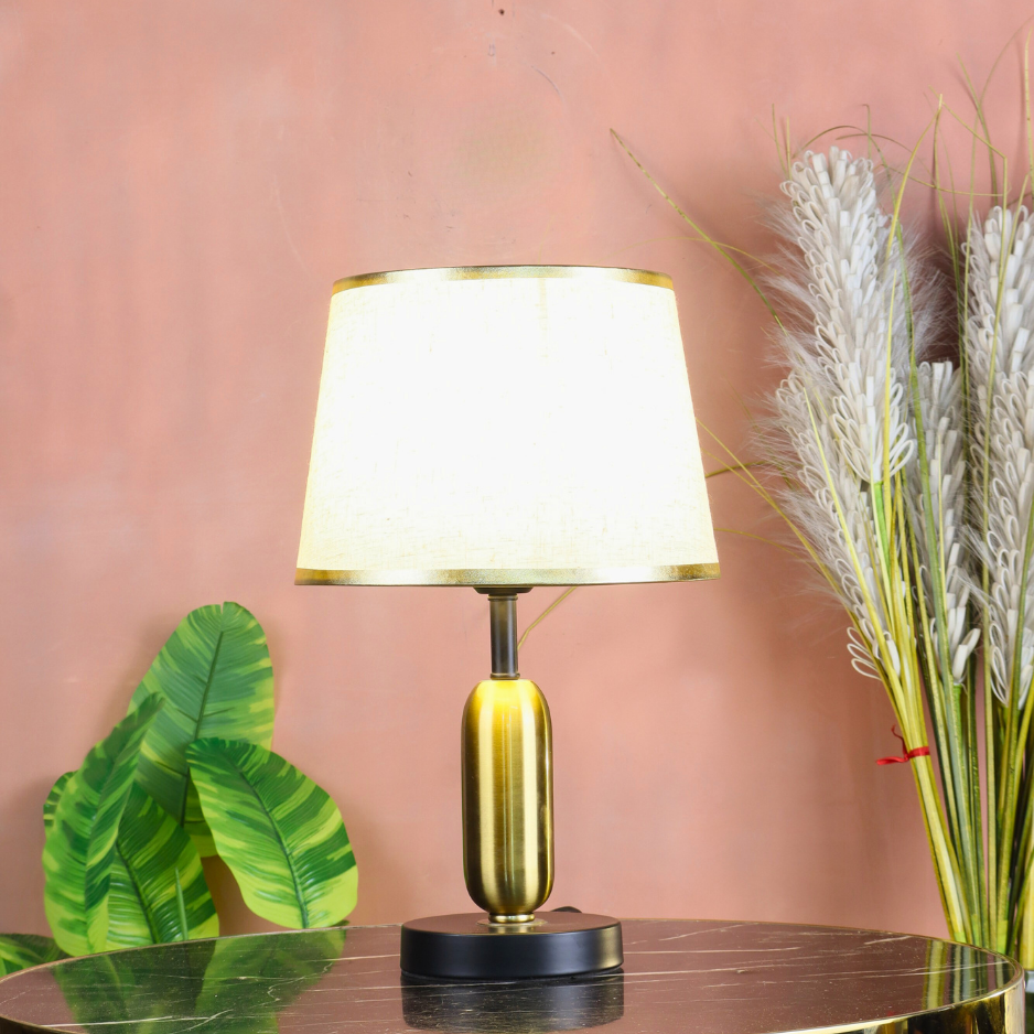 Bring understated luxury to your interiors with the BRILORA Table Lamp, a perfect harmony of brushed gold elegance and matte black sophistication. Designed to elevate contemporary spaces, this lamp diffuses a warm, ambient glow through its white fabric shade trimmed in gold, creating a subtle yet refined statement.