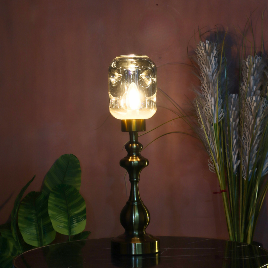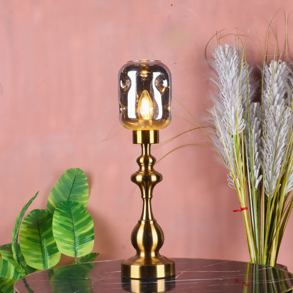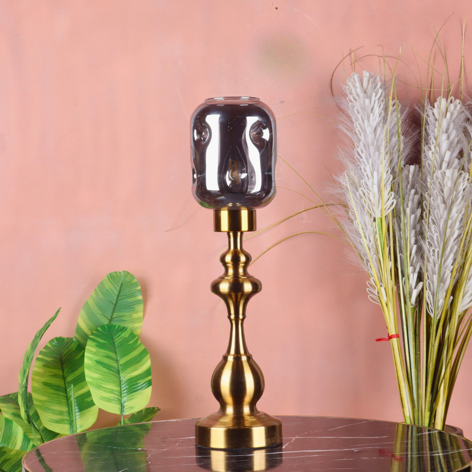 Grace your interiors with the CLARIVESSA Table Lamp, a perfect fusion of classical elegance and contemporary refinement. Its sculpted antique gold metal base pairs beautifully with the smoke-tinted glass shade, creating a timeless silhouette that radiates sophistication.