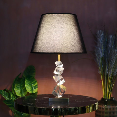 The CYLORRAX Table Lamp embodies refined elegance through its artistic geometry and crystal clarity. Standing at 54 cm, this striking piece features a stack of precision-cut crystals mounted on a sleek metallic base, crowned with a matte-black fabric shade that radiates sophistication and contrast.
