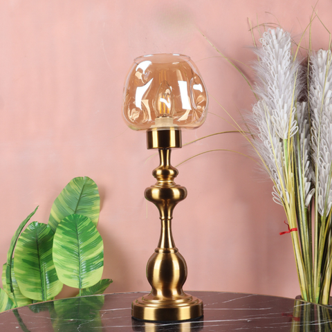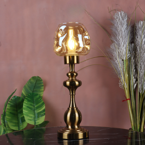 Elevate your interiors with the timeless DECORESSA Table Lamp, a perfect blend of classic design and modern elegance. Standing tall at 46 cm, this lamp features a brushed gold metal base and a handcrafted amber glass shade that diffuses a soft, warm glow — adding charm and sophistication to any setting.