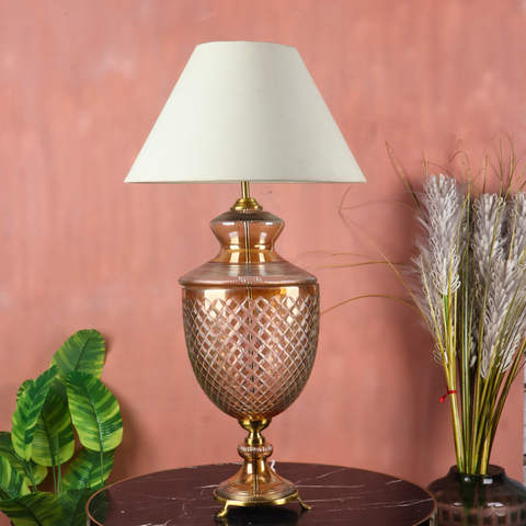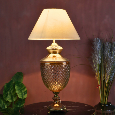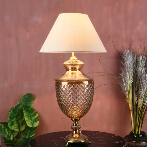 Bring timeless sophistication into your interiors with the NOVYSS Table Lamp from Imperial Emporio. Crafted with a cut-pattern amber glass body and a brushed brass base, this lamp radiates warm, luxurious charm. The soft glow through the etched glass creates a refined ambience ideal for living rooms, bedrooms, or luxury lounges.