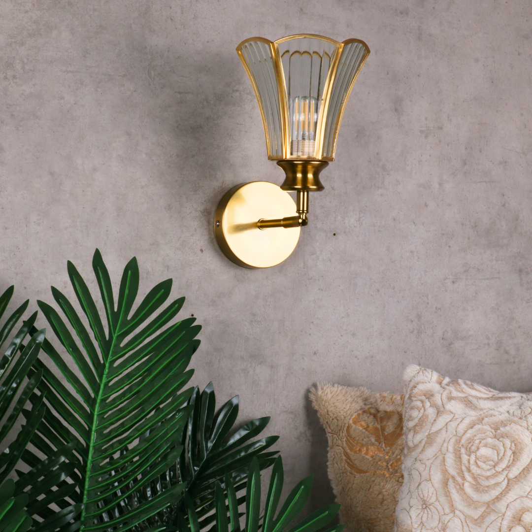 The Aurora Bloom Wall Light radiates charm and elegance with its petal-inspired glass shade and warm golden base. Resembling a blooming flower, the fluted clear glass diffuses light gracefully, creating a delicate and refined ambiance. This sconce is a perfect accent for classic, vintage, or transitional spaces, adding a graceful flourish to any wall it adorns.