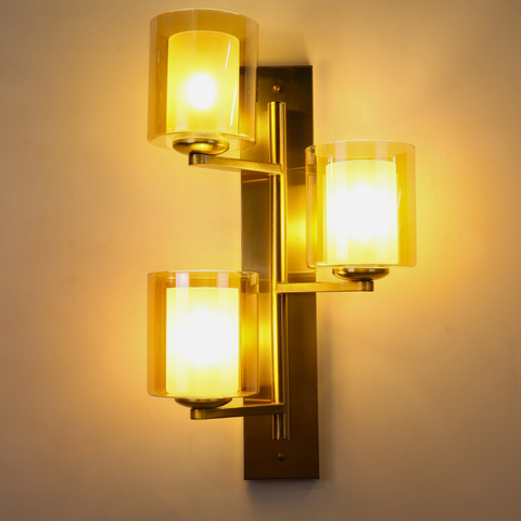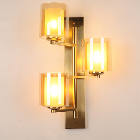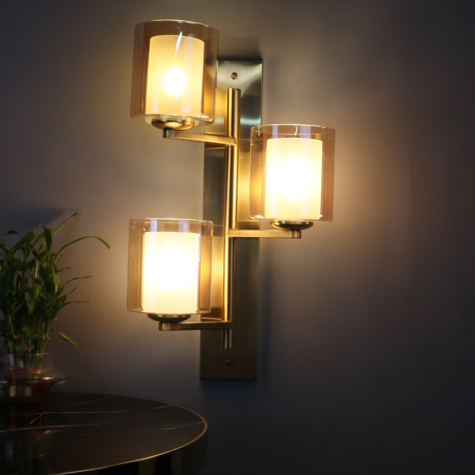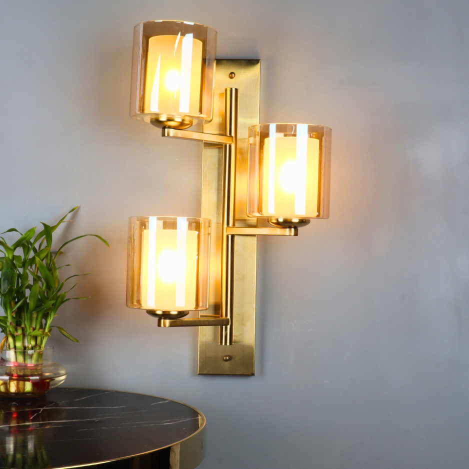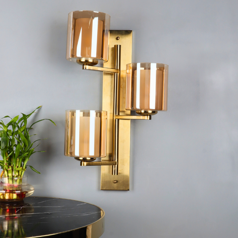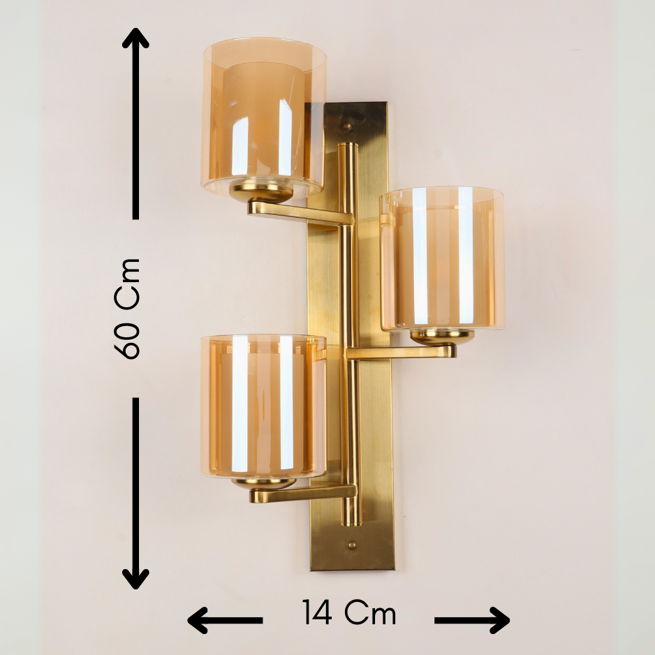 The Pavira Wall Light is a perfect blend of classic elegance and modern luxury. Featuring three amber-tinted cylindrical glass shades mounted on a sleek vertical gold-finished frame, this fixture creates a warm, ambient glow that enhances any interior.