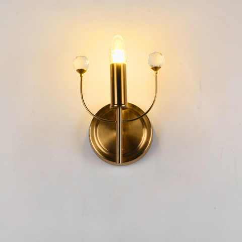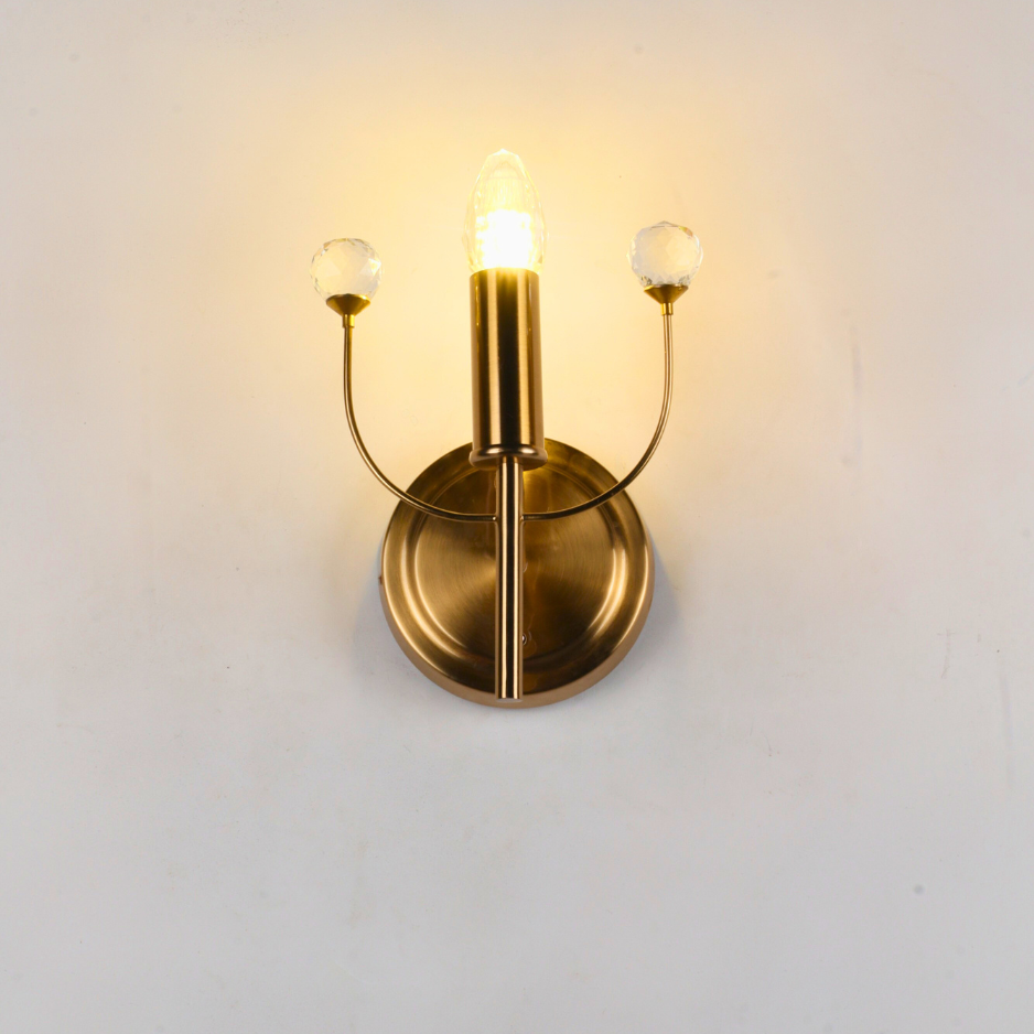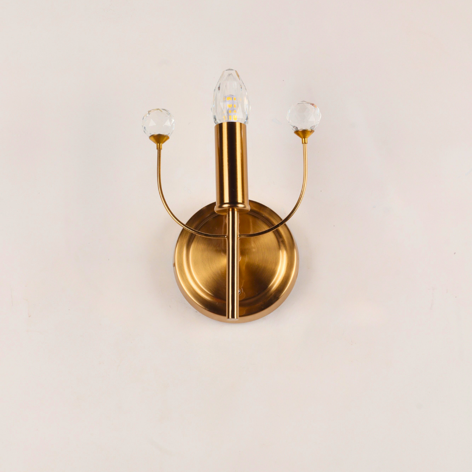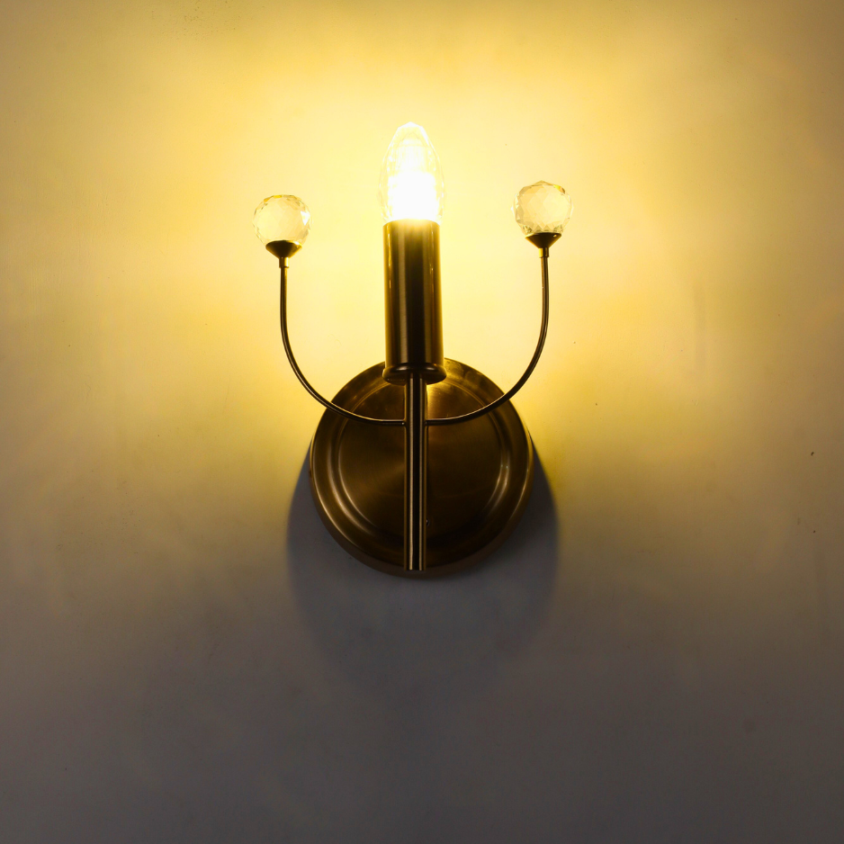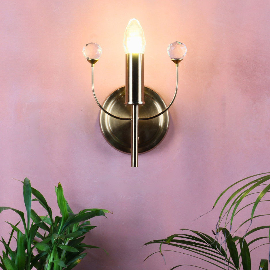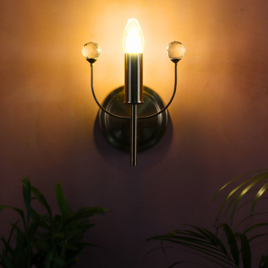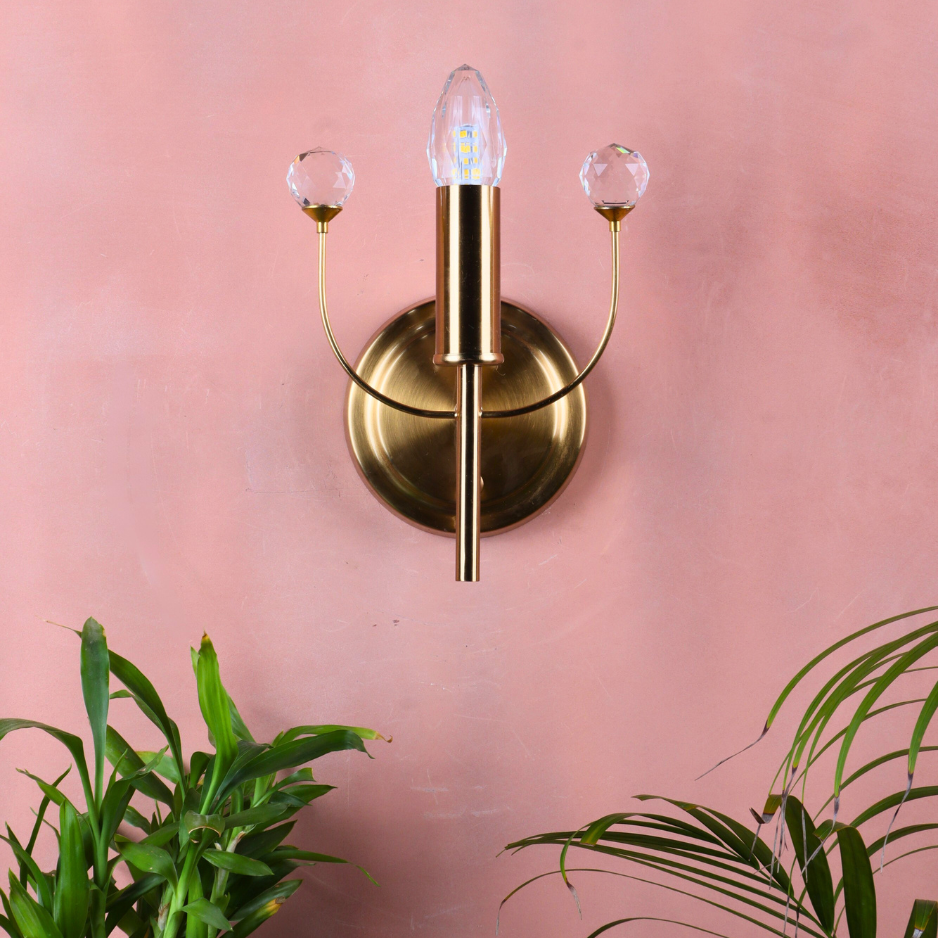 The ZENVIRA E14 Wall Light embodies timeless sophistication with its candle-inspired design and crystal accents. Crafted in a luxurious gold finish, it features a central E14 holder with two delicate side arms topped with crystal spheres. The design allows an optional fabric or glass shade to be fitted, making it versatile for both traditional and contemporary interiors.