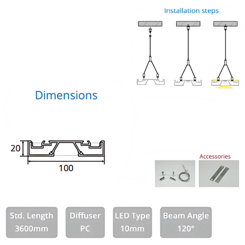 The ALING LIGHT 3600MM is a wide-format, suspended LED aluminum profile designed for expansive lighting needs in commercial, industrial, and architectural environments. With a generous 100mm width, it accommodates dual or multi-row LED strips, ensuring high-intensity, uniform illumination with a sleek, professional finish.