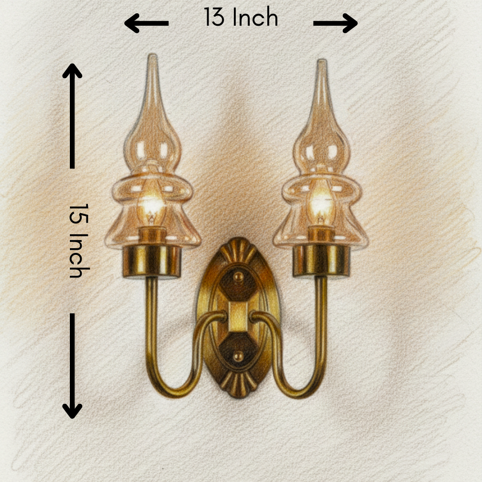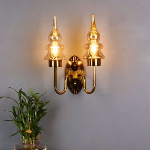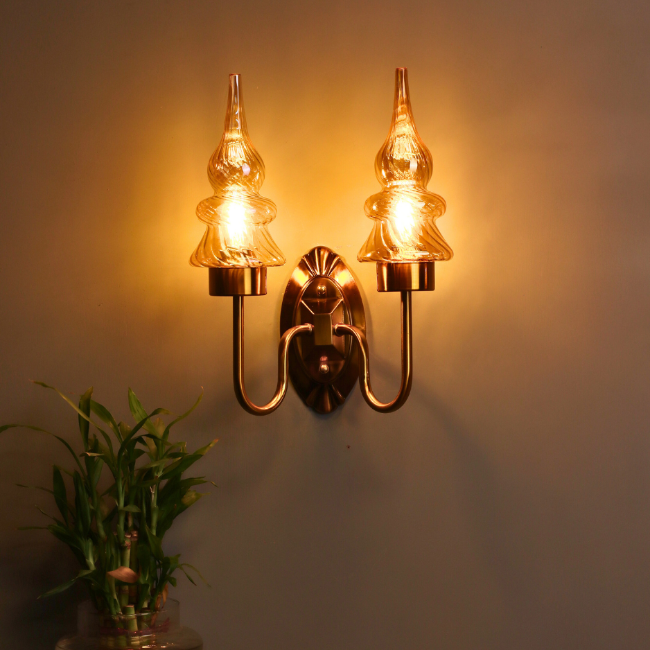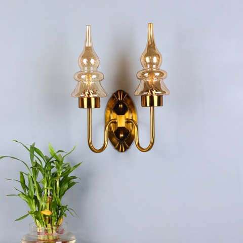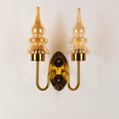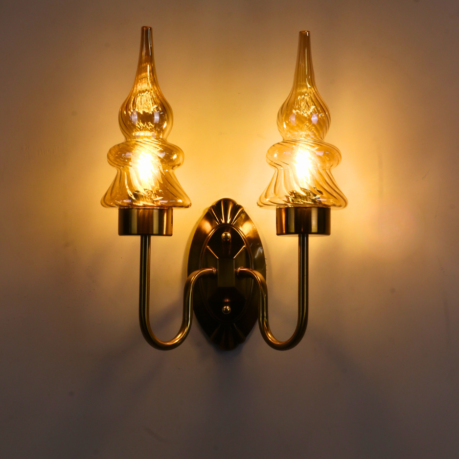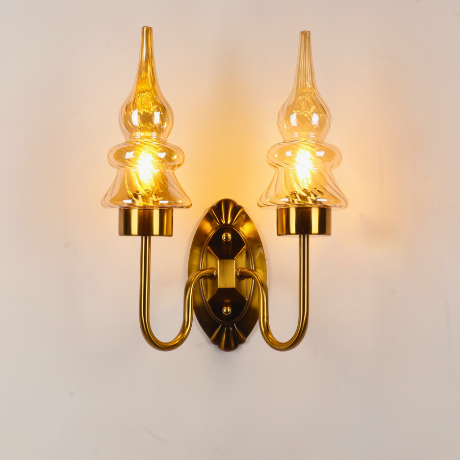 Discover the enchanting allure of the Elysian Modern Art Glass Wall Sconce. This unique fixture is a harmonious blend of contemporary minimalism and artistic expression. It features a sleek, circular brass-toned backplate and a gracefully curved arm that culminates in a truly distinctive shade. The amber-hued glass shade is a work of art in itself, with a tiered, sculptural form that tapers to a elegant point.