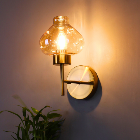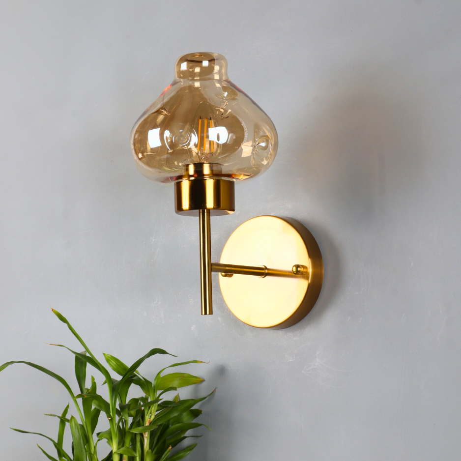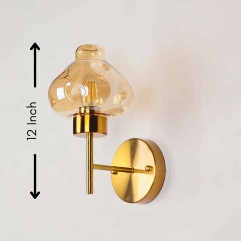 The LUSTARO Wall Light is a statement of modern luxury and artistic design. Standing 12 inches tall, it features a beautifully crafted amber-tinted glass shade with organic bubble-like contours, mounted elegantly on a golden-finished frame.