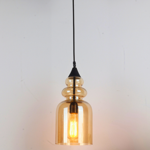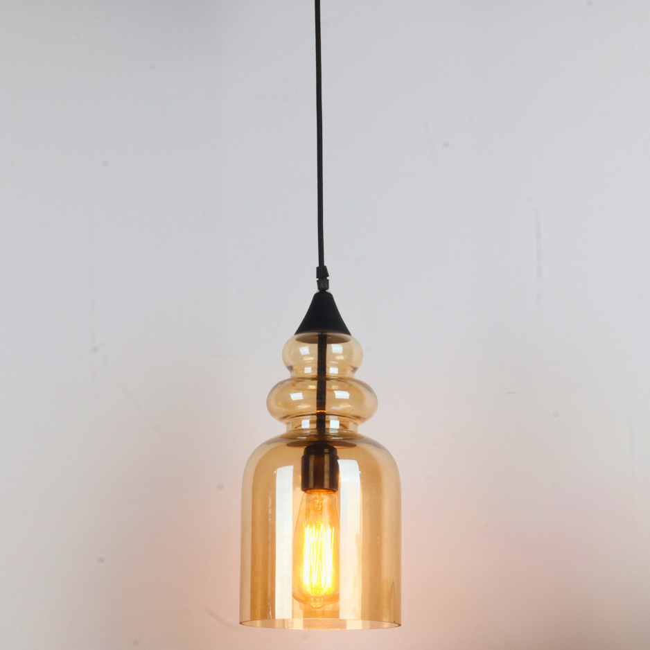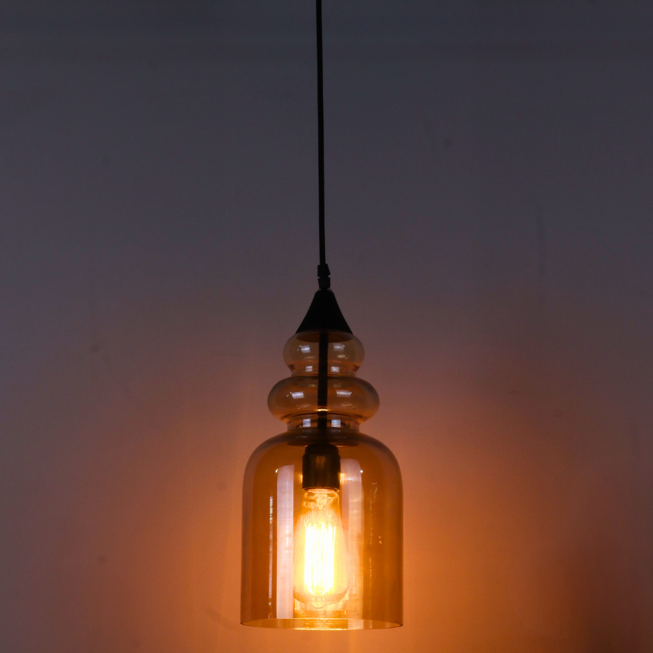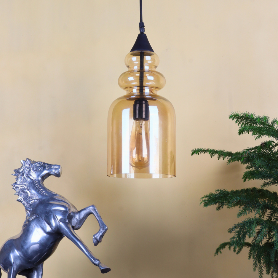 Design: Tall cylindrical pendant with graceful amber glass shade