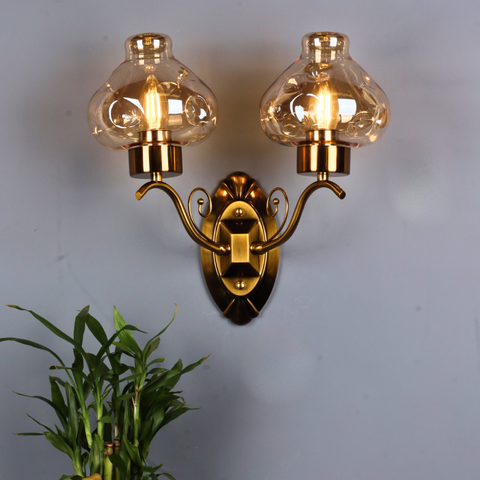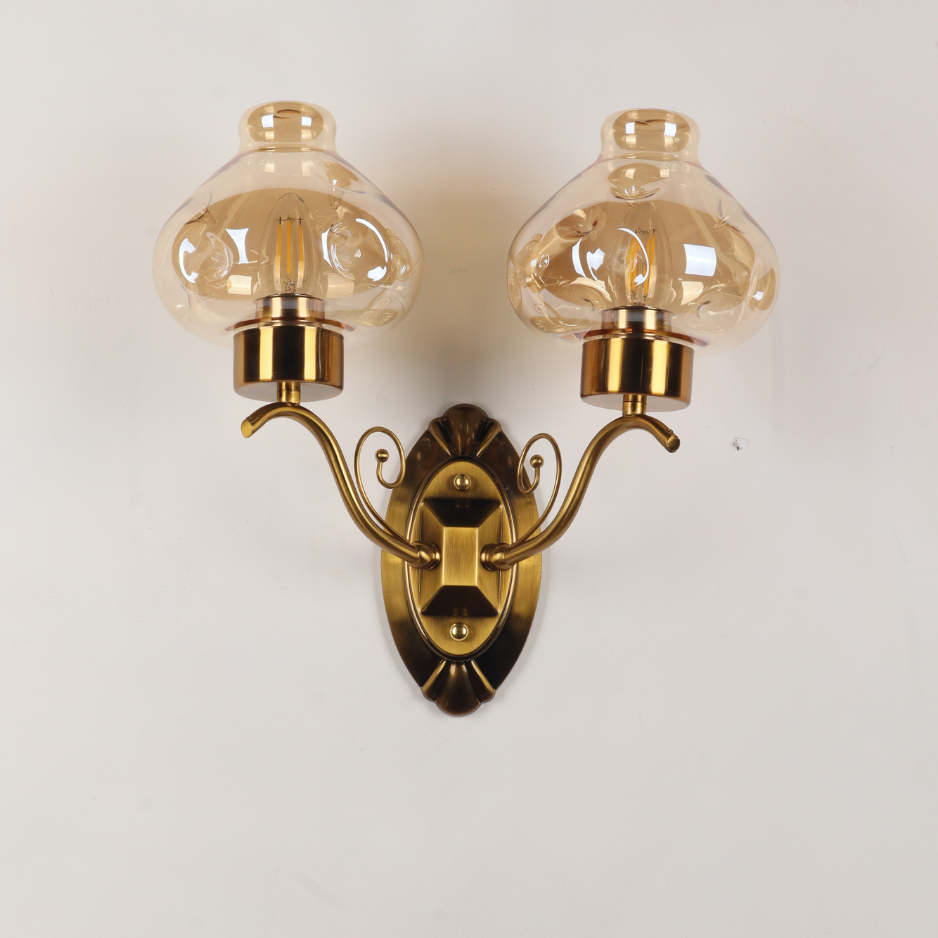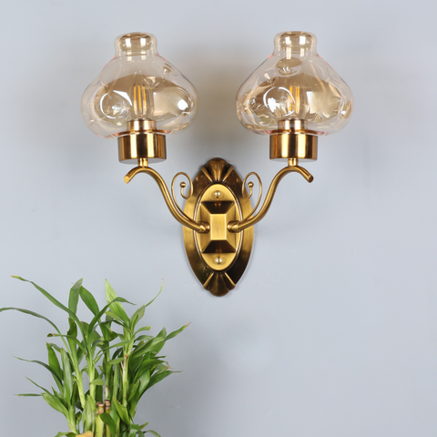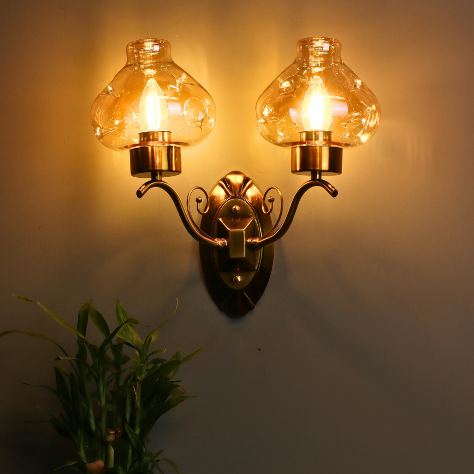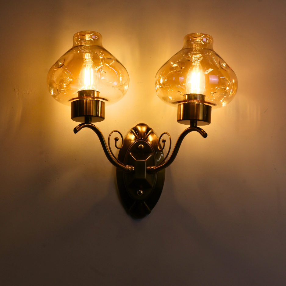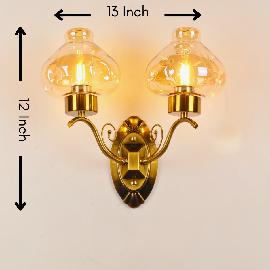 Double the warmth and charm with the Vintara Twin Vintage-Inspired Wall Sconce. This stunning fixture takes the classic elegance of the single Vintara sconce and doubles it, creating a balanced and beautiful focal point for any room. It features a finely detailed brass-toned backplate with two gracefully curved arms, each holding a beautifully shaped amber glass shade.